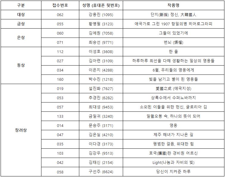 올해로 네 번째를 맞이한 이번 공모전은 ‘보훈’의 의미를 더욱 폭넓게 담아, 독립운동가뿐만 아니라 우리 일상 속에서 묵묵히 나라를 위해 헌신하는 영웅들을 조명하는 뜻깊은 시간이었습니다.